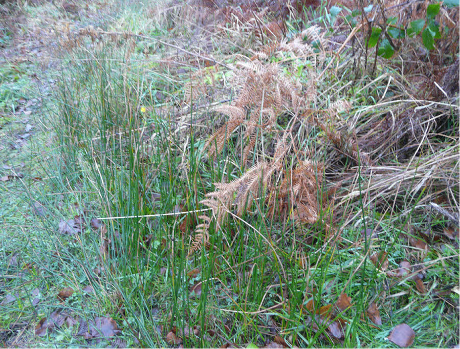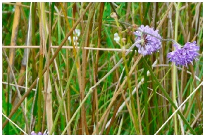 Areas, which can be classified as wet heath, lie between the raised dry heaths and the bog and fen communities. Patches of rushes and low spreading brambles characteristically indicate these areas. Purple Moor Grass and Quaking-grass are also found as well as occasionally the uncommon Heath Spotted Orchid. Depending on the season the amount of water in the soil varies. This coupled with the unstable nature of the springs tends to create areas of wet heath where formerly they were grassland.