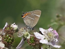 An Emerald Damselfly was found at the small pond (02 July) and a Banded General (Soldierfly) was seen the following day (03 July). Mark saw another Hobby (05 July) and a Blackneck moth was found. A Norfolk Wildlife Trust walk, celebrating Commons took place (07 July) and Bog Bush Crickets were seen as well as Bee and Marsh Fragrant Orchids. The first White-letter Hairstreaks appeared (12 July) and a male Black-tailed Skimmer was noted. A male Silver-washed Fritillary (17 July) and Purple Hairstreak (18 July) were new for the year and a moth trap ‘captured’ a Small Elephant Hawkmoth, a species that has not been recorded since 2012. A Little Egret was noted heading east (19 July) and the strange hairy-eyed hoverfly Eristalinus sepulchralis was present (21 July). Four Red Kites headed west (22 July) and a female Pantaloon Bee (24 July) was collecting pollen from Cat’s-ear. These bees are so-called because of the over-sized, bright yellow pollen baskets they have on their hind legs. In Norfolk it is probably at its northernmost range. A Six-spot Burnet moth was seen (29 July). This is again an uncommon occurrence for the area, however, they are plentiful around the cliff-top near Beeston Bump. Its caterpillar’s food plant is Common Bird’s-foot Trefoil.